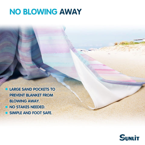 Instead of being anchored by anchor stakes there are four built-in corner pockets that prevent the blanket from blowing away, just fills these pockets with sand to weigh down the blanket.